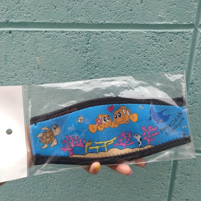 ふちの色はブルー サンゴとお魚達のマスクストラップカバーです。 いろいろなグッズにもなっている、 人気のお魚達のデザインです。 ぜひポッパー君達と一緒に泳ぎに行ってくださいね!